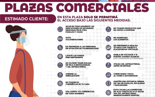 Para el caso de las plazas comerciales, los clientes deberán seguir las indicaciones antes mencionadas y adicionalmente acatar los señalamientos para el desplazamiento marcados en el suelo, evitar aglomeraciones en cajas de pago y elevadores, cederles el paso a personas en situación de vulnerabilidad, no tocar objetos que no vayan a comprar y no manipular alimentos.