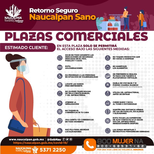 El Gobierno de Naucalpan recuerda a la población que estamos en Semáforo Rojo, con apertura de restaurantes, centros comerciales y pequeños comercios con un aforo máximo del 30 por ciento.