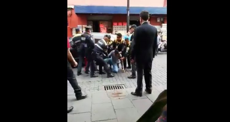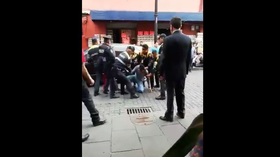 Al menos seis policías de Tránsito de la Ciudad de México, incluida una mujer, sometieron a dos hombres por agredirlos, en calles de la colonia Centro.
