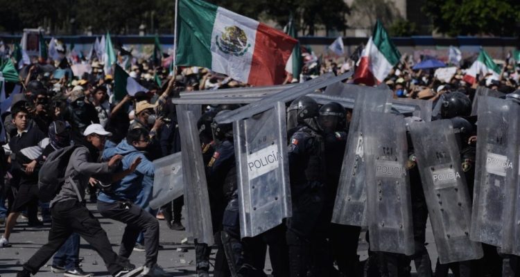 Llamando la atención que las protestas comenzaron pacíficamente, pero pasaron a violentas cuando un grupo de personas encapuchadas conocidos como Bloque Negro derribó vallas metálicas que protegían Palacio Nacional, lo que provocó enfrentamientos con la policía antidisturbios, que respondió con gas lacrimógeno, toletes, escudos, extinguidores e, incluso agresiones físicas como patadas, puñetazos y lanzamiento de piedras contra los manifestantes, e inclusive también contra reporteros de medios de comunicación.