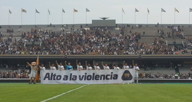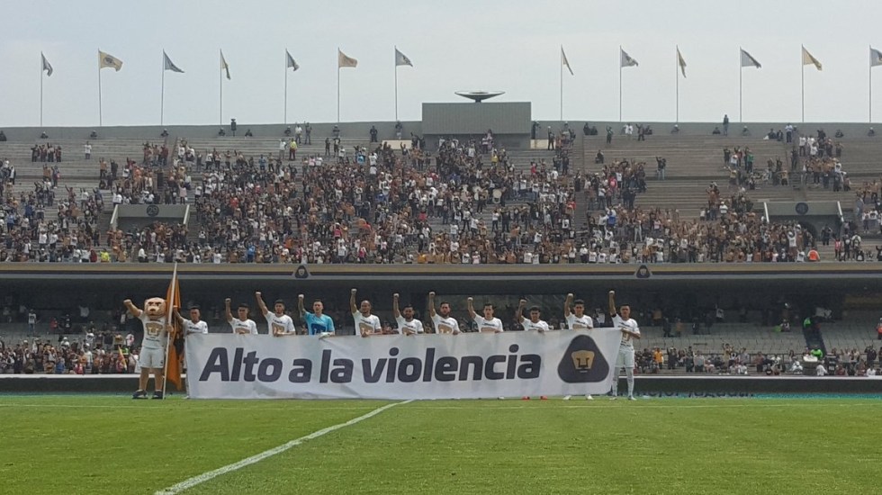 Los Pumas saltaron este domingo a la cancha para entonar el himno de la UNAM con una manta que decía “Alto a la violencia”.