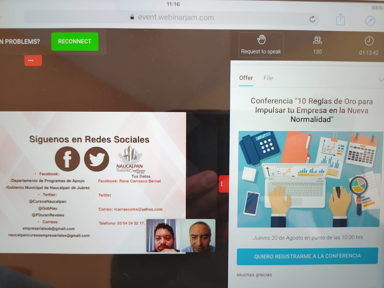 El próximo jueves 20 de agosto, a las 10:00 horas, el Gobierno de Naucalpan ofrecerá el webinar 10 Reglas de Oro para Impulsar tu Empresa en la Nueva Normalidad, impartido por Omar Cortés, fundador y director general de Consultoría Omar Cortés. Las personas interesadas pueden inscribirse en https://event.webinarjam.com/register/46/vywr2tv0
