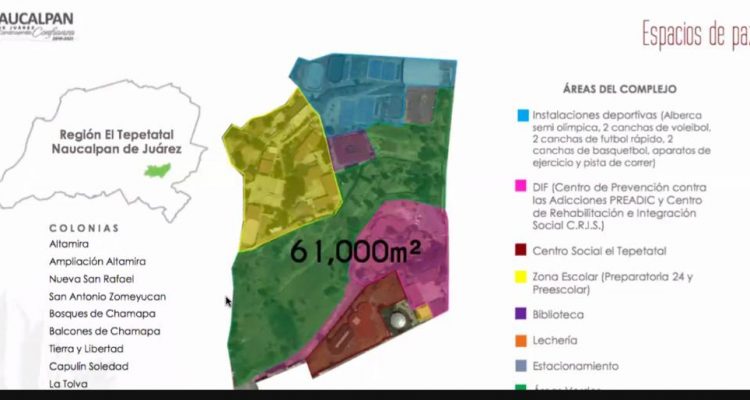 Concebido como parte de los Objetivos de Desarrollo Sostenible del Gobierno naucalpense, el Proyecto Centro Municipal de Prevención Social 2020 incluye trabajos de rehabilitación de espacios públicos, mejora del entorno urbano, construcción de un Centro Social, de unidades deportivas y una biblioteca en un área de 61 mil metros cuadrados, que abarca nueve colonias naucalpenses.