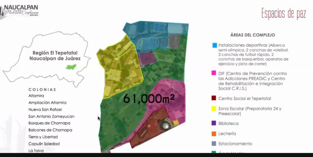 Concebido como parte de los Objetivos de Desarrollo Sostenible del Gobierno naucalpense, el Proyecto Centro Municipal de Prevención Social 2020 incluye trabajos de rehabilitación de espacios públicos, mejora del entorno urbano, construcción de un Centro Social, de unidades deportivas y una biblioteca en un área de 61 mil metros cuadrados, que abarca nueve colonias naucalpenses.