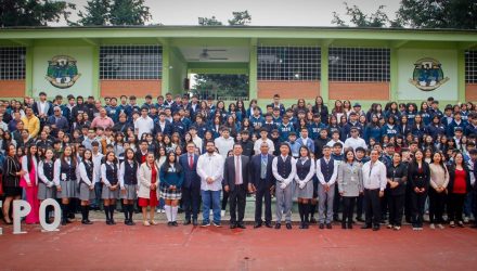 El alcalde Isaac Montoya Márquez, al inaugurar el ciclo escolar 2025-2026 en la Escuela Preparatoria Oficial No. 324, acompañado del director general de Educación Media